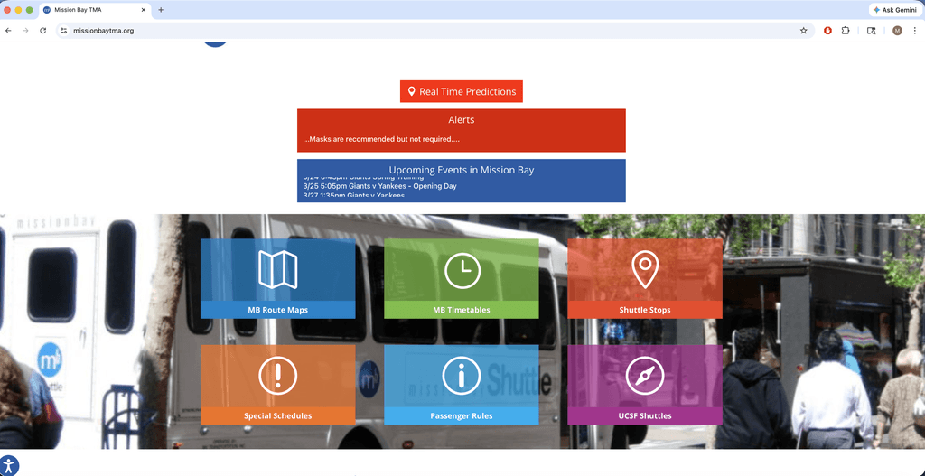 The Mission Bay Shuttle is a free weekday bus service in San Francisco’s Mission Bay neighborhood, run by a local nonprofit to connect offices, homes, UCSF, Chase Center, and CCA to BART, Caltrain, and transit hubs.